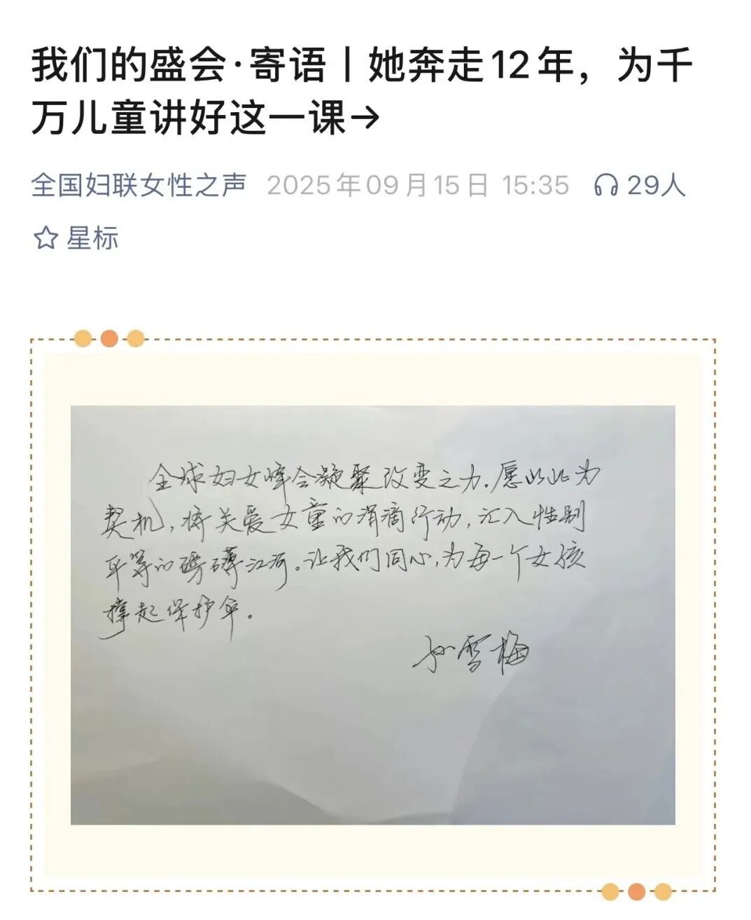 对于今年将在北京召开的全球妇女峰会,孙雪梅希望借此凝聚起“推动改变”的力量,让关爱女童的微小行动汇聚成推动性别平等的磅礴力量,让更多人携手同行,为每一名女童撑起坚实、温暖的“保护伞”。