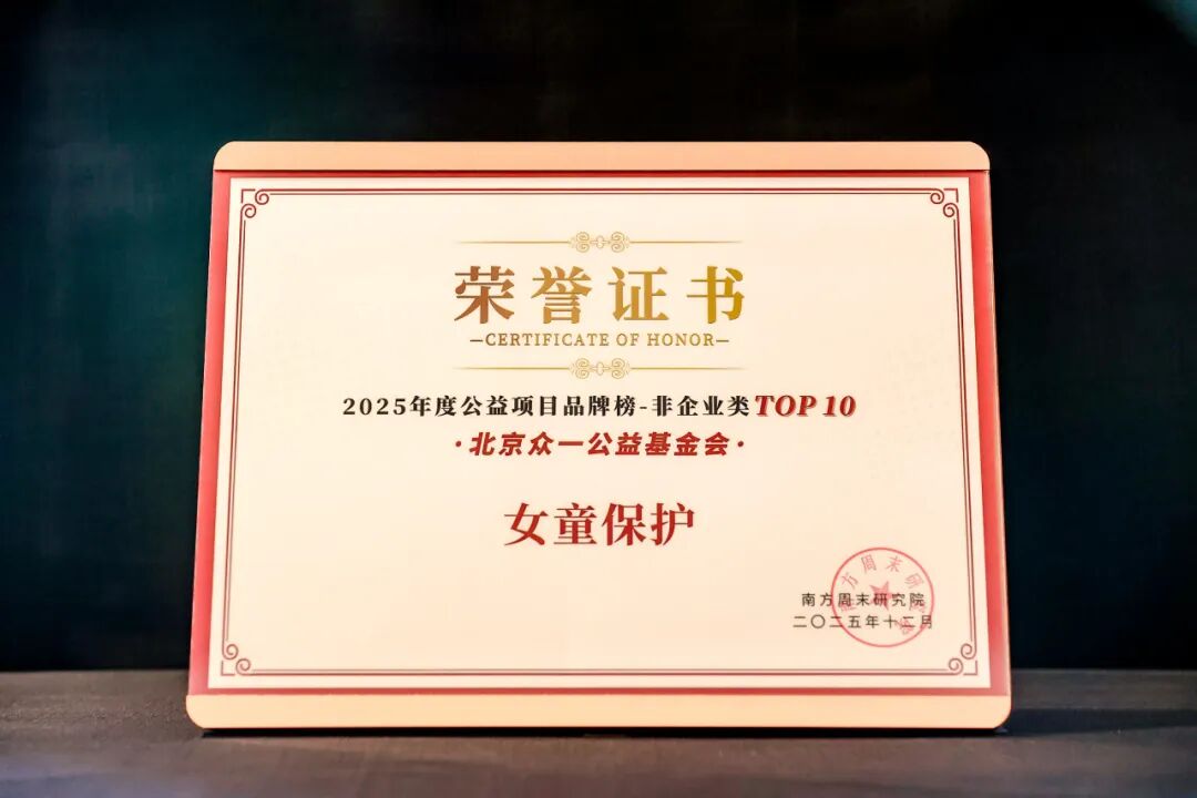 2025年12月4日,南方周末第六届筑梦者公益大会在北京召开,“女童保护”在本次发布的2025年度公益项目品牌榜(非企业类)中荣登TOP10,这也是“女童保护”自2022年起连续四年登上该榜单的TOP10。